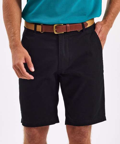 Men's chino shorts with two swings pockets and two back jet pockets with button fastening. Zip fly and button fastening to the front. Soft finish fabric. Product contains no branded neck label. Removable Kimble or looped garment tags. Inner seam label holds important product information on one label with a second label containing brand information which can be cut-away. Please note old stock may contain a fixed branded label.