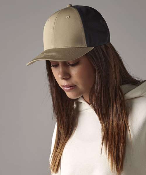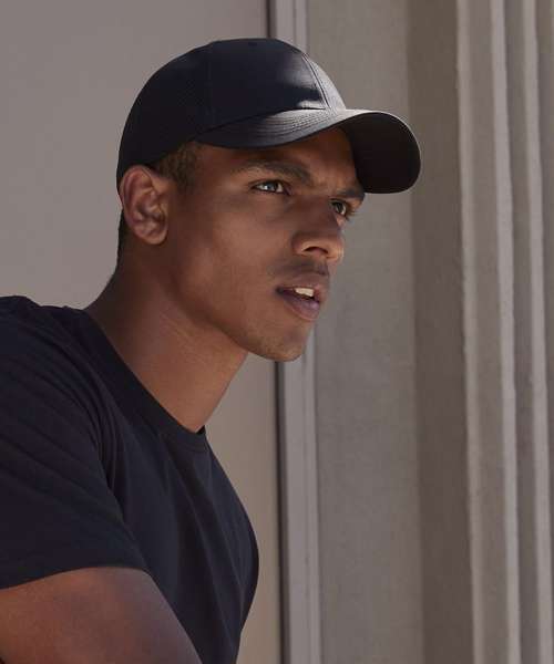 Contains 100% certified recycled cotton. Coolmax® fabric sweatband. Ventilation eyelets. 6-panel design. Mesh ventilation panels. Pre-curved peak. TearAway label for ease of rebranding.