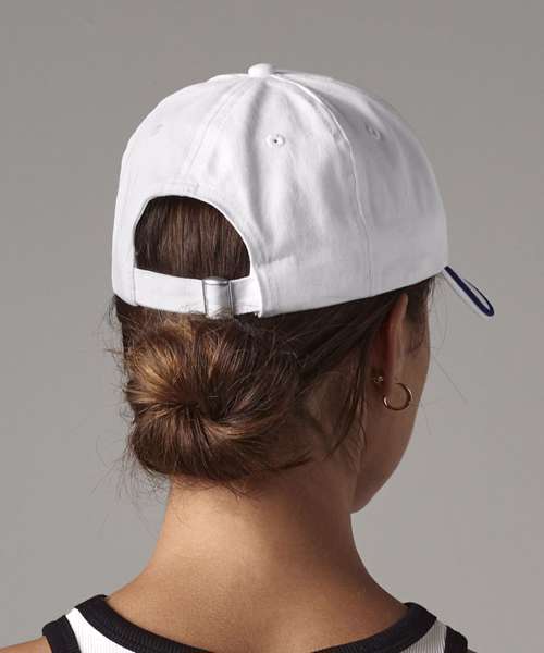 Structured front panel. 5-panel design. Pre-curved peak. Contrasting colour piped peak edge. Stitched ventilation eyelets. Self-fabric strap with tri-glide buckle.