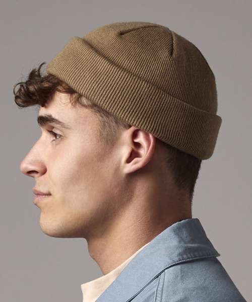Once reserved solely for workwear-inspired looks, the mini fisherman beanie has evolved into a popular street style essential. This mini pull-on style, featuring a double turn-up cuff, is a close-fitting beanie designed to sit on top of the head, just above the ears. Made from 100% certified recycled polyester, this neat design is perfect as both a sustainable and a fashionable choice.