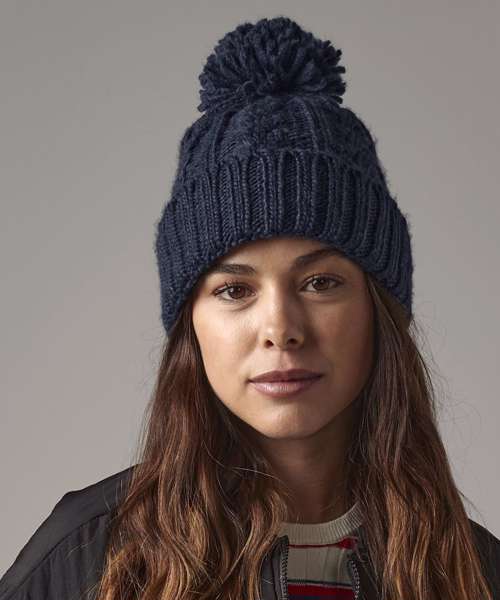 Tear-out label for ease of rebranding. Heavyweight melange cable knit. Self-coloured pom pom. Hand-knitted feel. Suprafleece® thermal band. Cuffed design for optimal decoration.