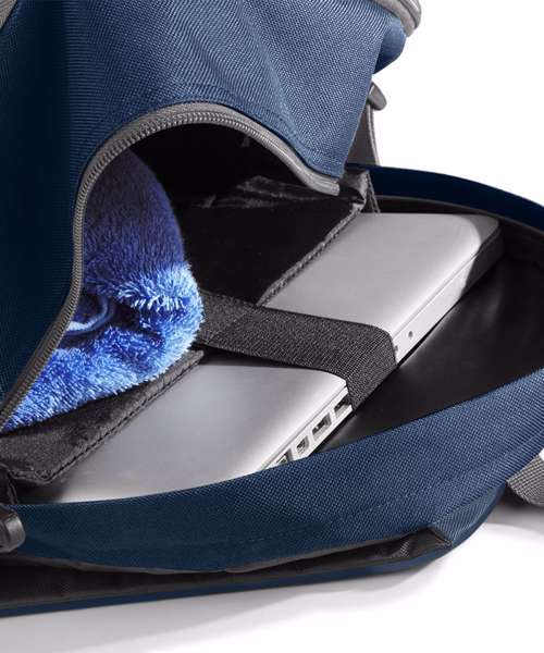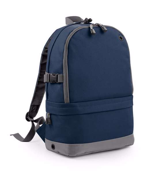 TearAway label for ease of rebranding. Water-resistant fabric. Dual compartment design. Laptop compatible up to 15.6". Padded laptop compartment. Media pocket and headphone port. Padded adjustable shoulder straps. Wet pocket. Compression straps. Padded back panel. Organiser section. Elasticated bottle loop. Metal ventilation eyelets. Grab handle.