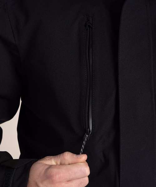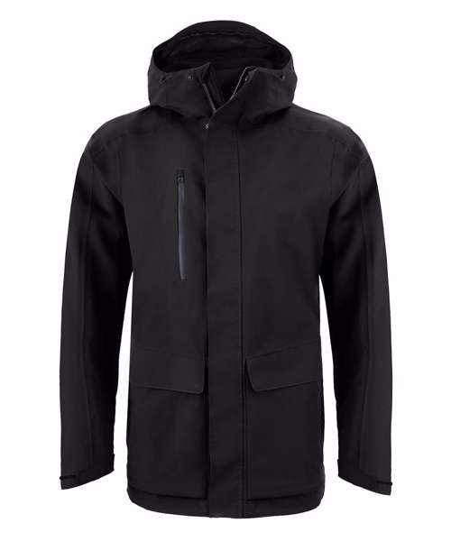 3-in-1 jacket. Waterproof and breathable shell outer with a softshell inner jacket. 10,000mm waterproof and 20,000g/ m2/ 24hrs breathable. Recycled polyester stretch mesh and recycled polyester taffeta lining outer. Recycled polyester elastane softshell with EcoShield DWR finish and striped microfleece back inner.