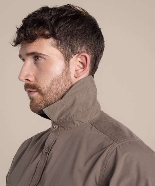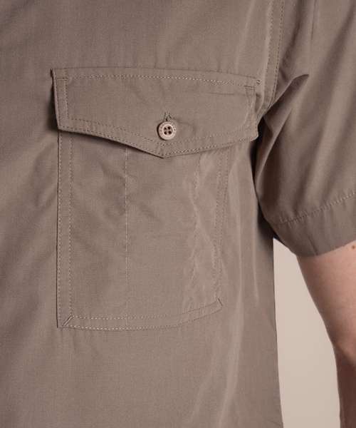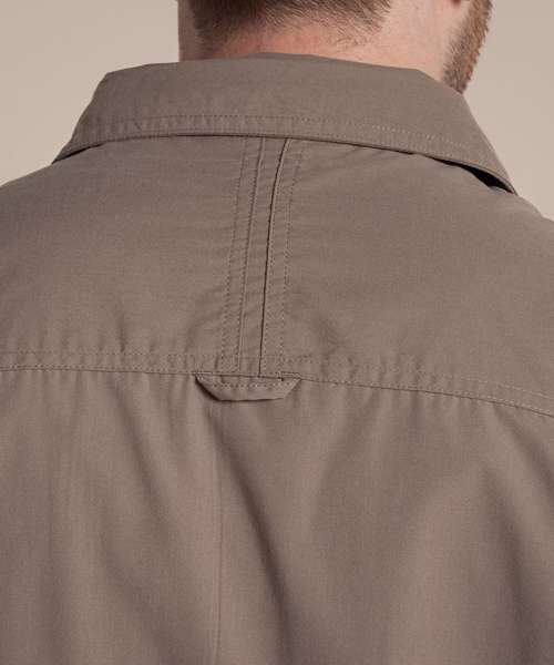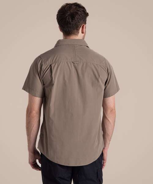 Short-sleeved shirt made with fabric too tough for insects to bite through. Recycled polyester cotton shirting and recycled zip tape. SolarShield collar. Nosi Defence technology.
