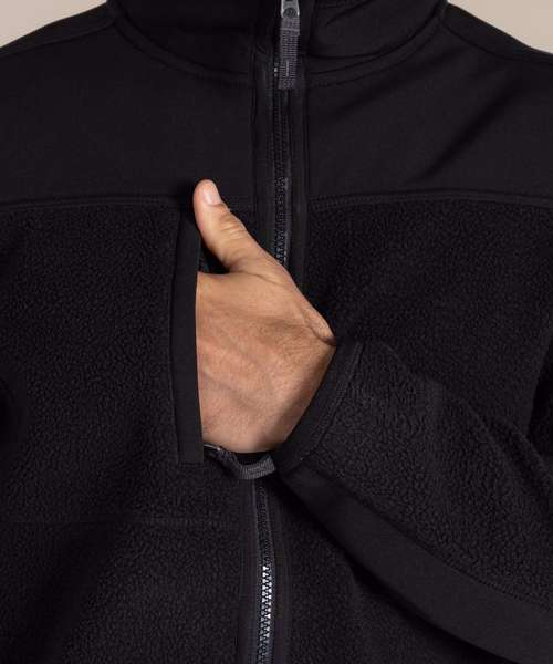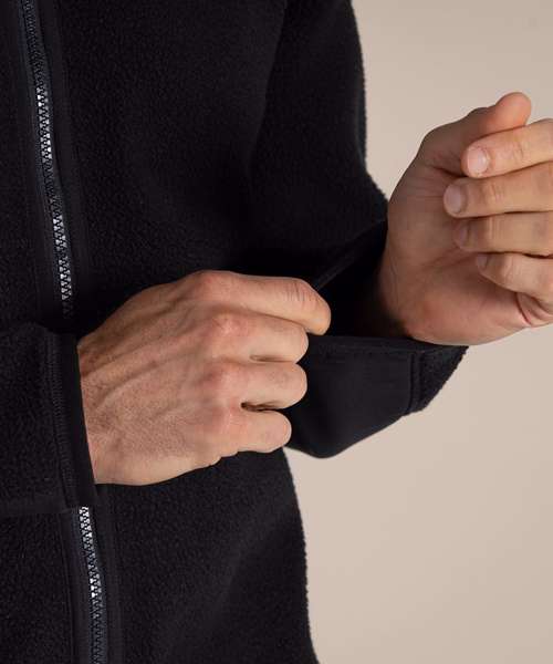 Recycled borg fleece with part-recycled polyester elastane and H2OShield DWR finish to upper body and lower back sleeve panels. Recycled zip tapes. GRS certified fabrics, ETI factories, REACH compliant.
