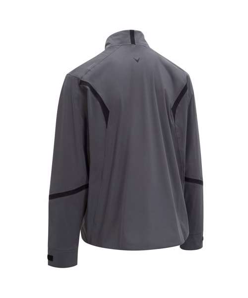 Fully-seamed waterproof jacket with adjustable hem and cuffs, featuring SwingTech technology and water-resistant zips. Includes Callaway print on the sleeve and Chevron print on back of neck.