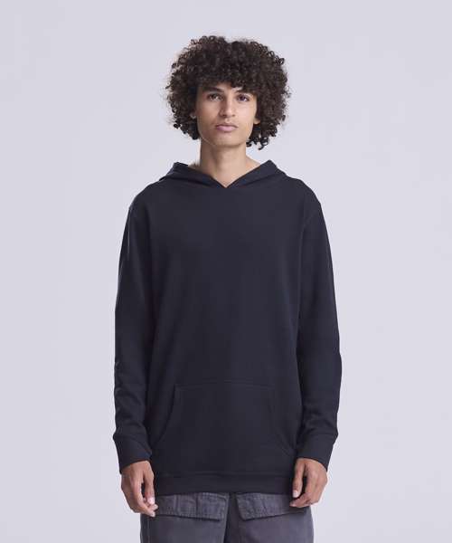 100% Organic hoody, with brushed inner and peached face. Kangaroo pocket, angled cuff detail and no drawcords for sleek look.