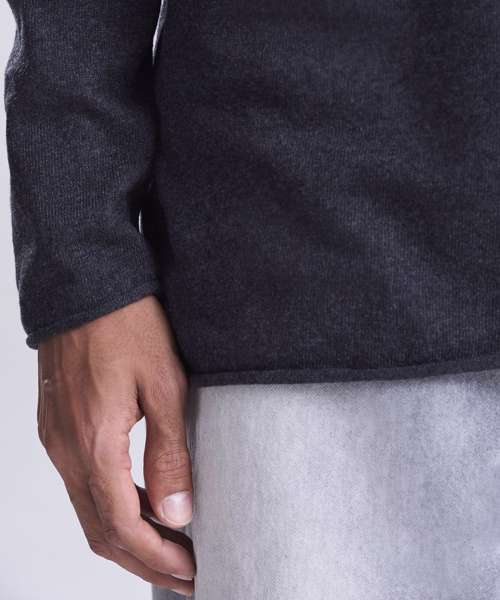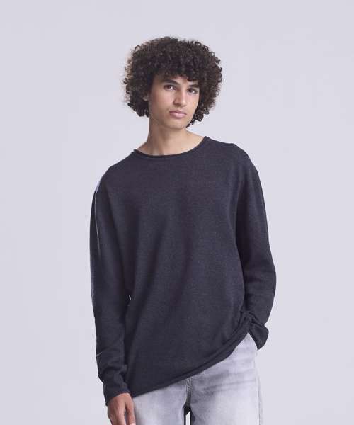 Lightweight sweater made from regenerated cotton. Set-in sleeves with rolled cuffs , hem and collar.