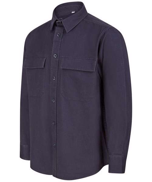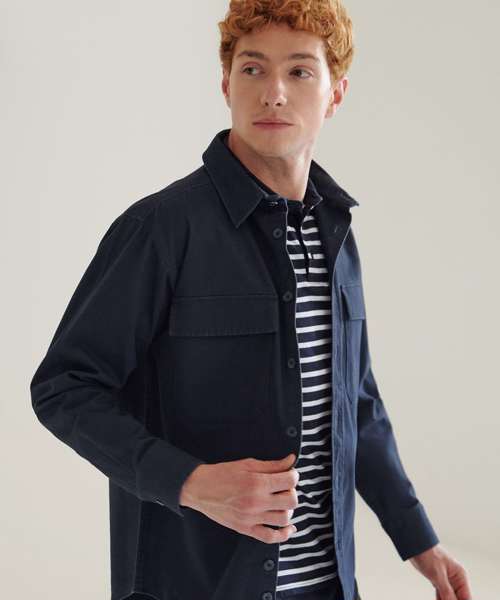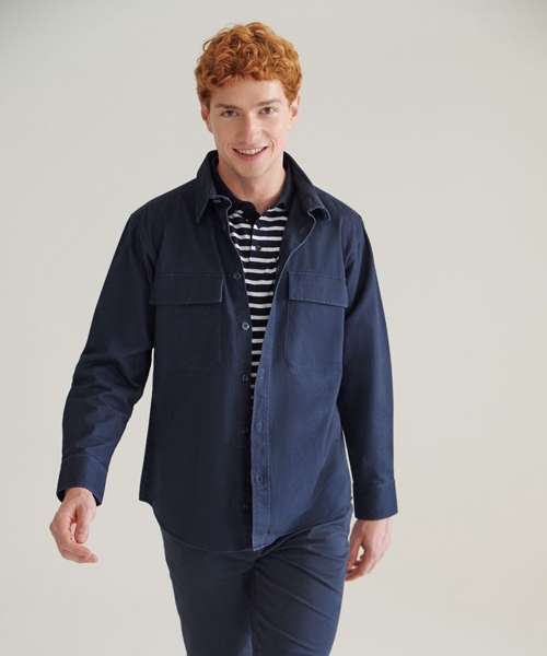 Heavyweight overshirt. Heavy garment wash. Back yoke. Twin-needle topstitching. Plastic horn-effect buttons. Mitred patch pockets with flap. Mitred cuff and placket with button fastening. Curved hem. Forward shoulder seam. Tag-free for easy rebranding.