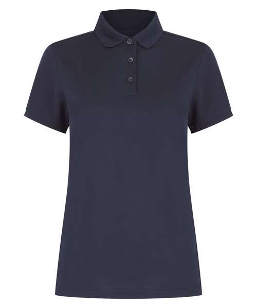 Polo shirt made from recycled polyester yarn with wicking properties. Regular fit with three-button placket. Henbury stand-up collar. 1x1 ribbed collar and cuffs. Dyed-to-match buttons. Female fit with shaped side seams. Henbury cut-out label for easy rebranding.