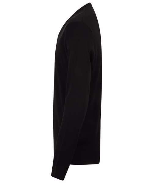 Cashmere touch acrylic yarn. Anti-pill. Smooth and soft finish. 12 gauge knitwear. Semi fashioned sleeve and neck. 1x1 ribbed hem, neck and cuffs.
