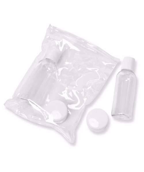 Travel bottle set with transparent PVC pouch. Includes 4 travel-sized reusable plastic bottles. Bottle size within accepted airline travelling limitations.