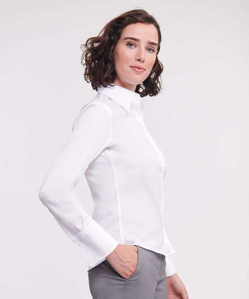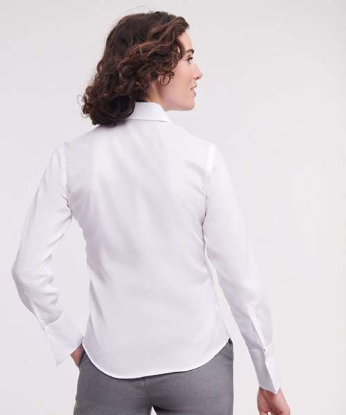 Made using the newest technologies of non-iron fabric that stays wrinkle free and keeps the wearer looking and feeling smart all day long. Contemporary fit combined with contemporary designed features. Stylish and relaxed long edged collar. Fashionable twin button fastening. Shaping at the waist for flattering feminine silhouette. Long, squared edge flared cuff with single button fastening and option for cuff links. Rounded hem.