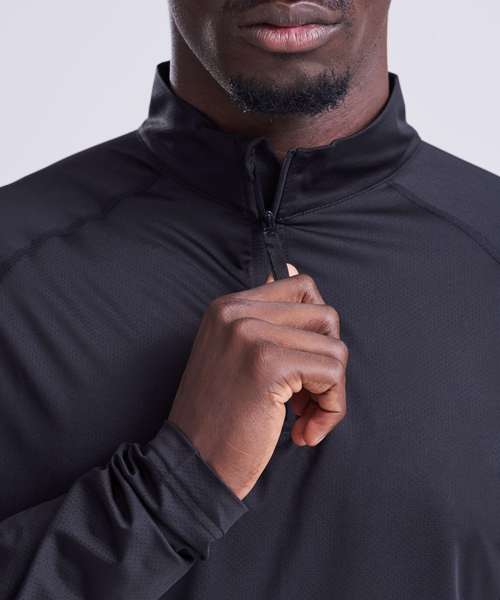 Raglan sleeves. Performance fabric. YKK 1/4-zip. Standard fit. Tear-away label. Quick-dry wicking fabric. Contains recycled polyester.