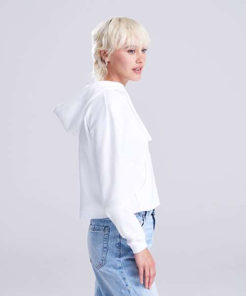 Girlie relaxed fit. Cropped cut with drop shoulder design. Kangaroo pouch pocket. Twin-needle stitching detail. Raw edge hem with cover stitching. Double fabric hood. Flat lace drawcords. Soft cotton faced fabric creates ideal printing surface. Simple tear-out label makes it perfect for rebranding. Brushed inner fleece. WRAP certified. SEDEX certified. Vegan certified.