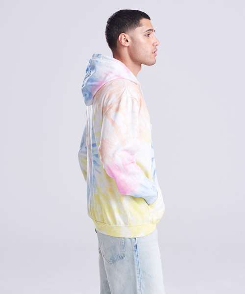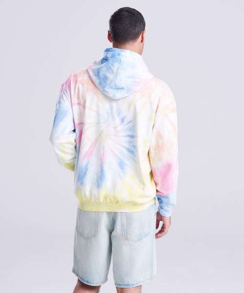 Relaxed fit. Twin-needle stitching detail. Double fabric hood with round drawcords. Kangaroo pouch pocket. Brushed inner fleece. Ribbed cuffs and hem. Tie-dye design. Every piece is unique. Size pip.