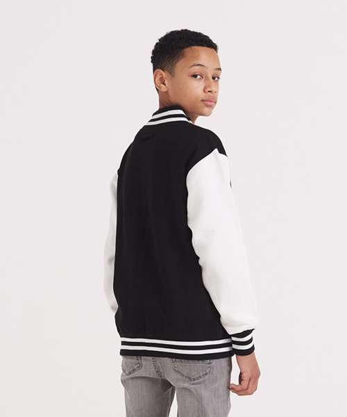 This kids varsity jacket is made in a sporty American style. It features a classic fit with contrast sleeves with excellent front popper fastening.