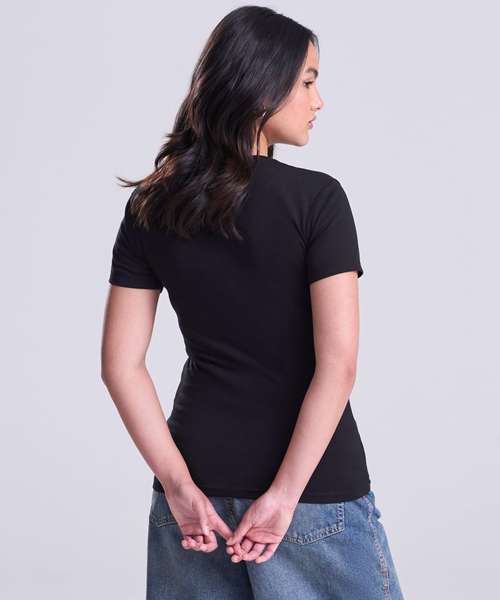Girlie fit short sleeved T. Size tab label. Triblend fabric for style and comfort. Taped neck. Twin-needle stitching on sleeves and bottom hem. Ribbed crew neck style. soft-feel fabric. Side seams. Set-in sleeves.