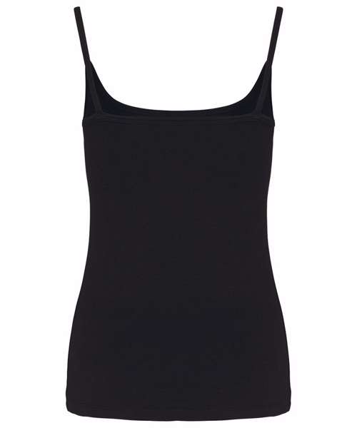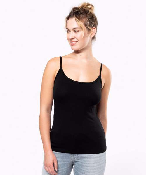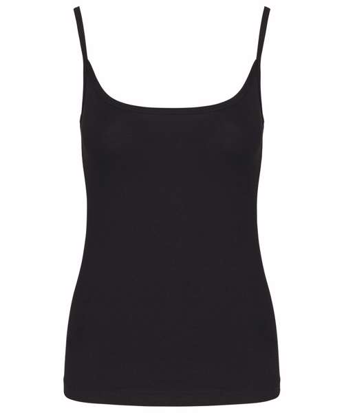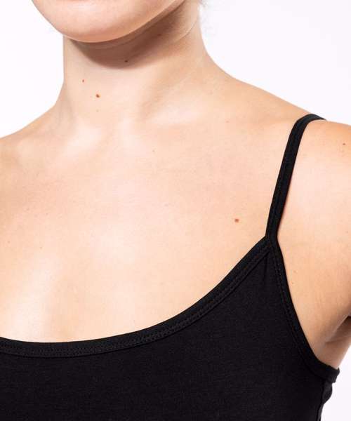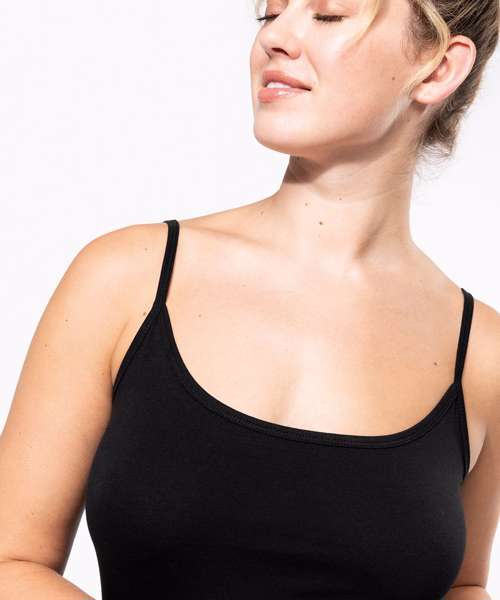 95% cotton / 5% elastane. Jersey knit fabric in combed cotton. Fine straps and feminine fit. Piping at the neckline and twin needle finish at hem. Certified STANDARD 100 by OEKO-TEX®N° CQ1007/7, IFTH.