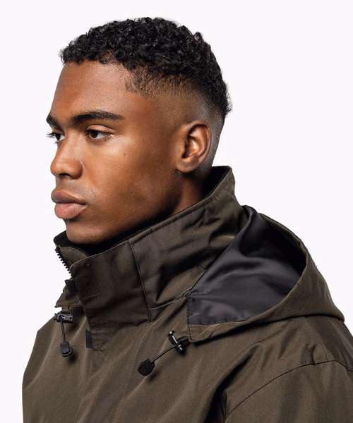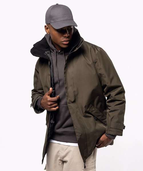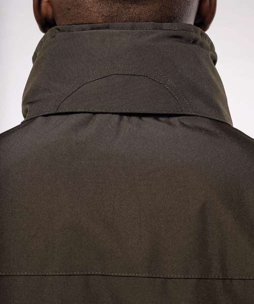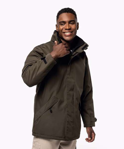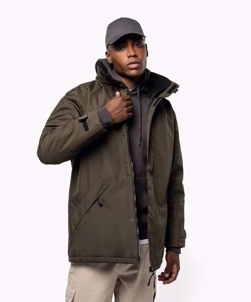 100% polyester Oxford outer - quilted polyester padding and lining. Zip fastening with tear release fastening and concealed press studs. 2 zipped outer pockets. 2 inside pockets (1 mobile phone pocket). Concealed hood. Fleece-lined collar. Zip access for decoration.