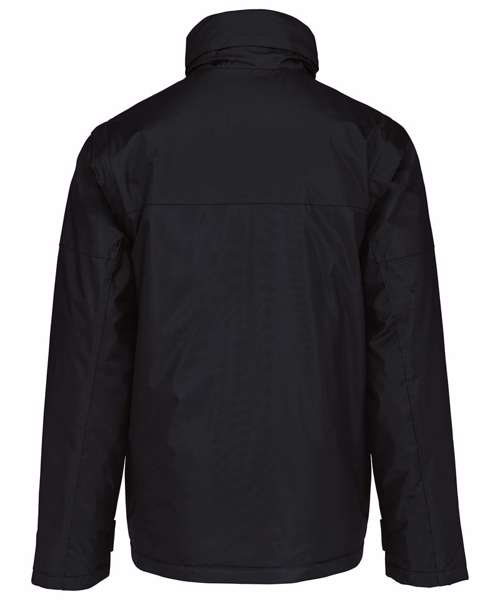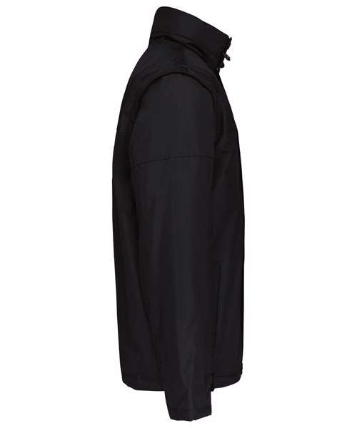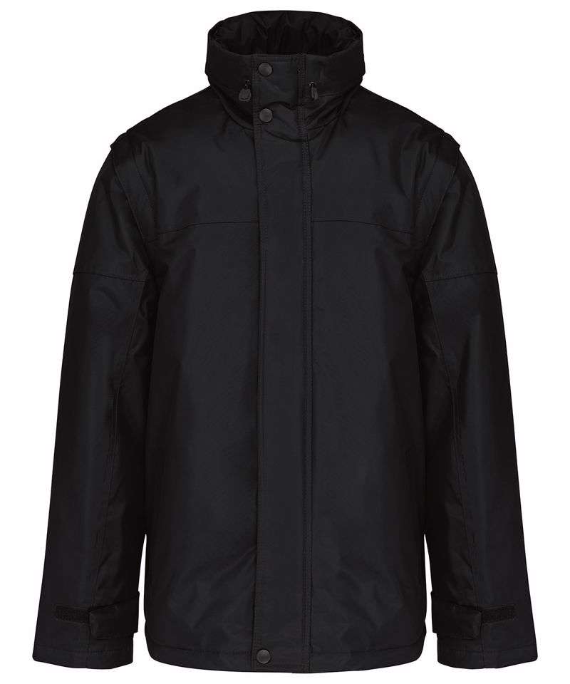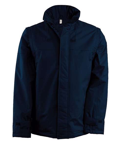 100% Polyester outer with PVC coating. Polyester padding and lining. Full-zip. Water-repellent with studded storm flap. Front pockets. Inside pocket, 1 mobile phone pocket. Detachable sleeves. Cuff adjusters with tear release fastening. Concealed hood with elasticated drawcord. Zip access for decoration. BSCI certified.