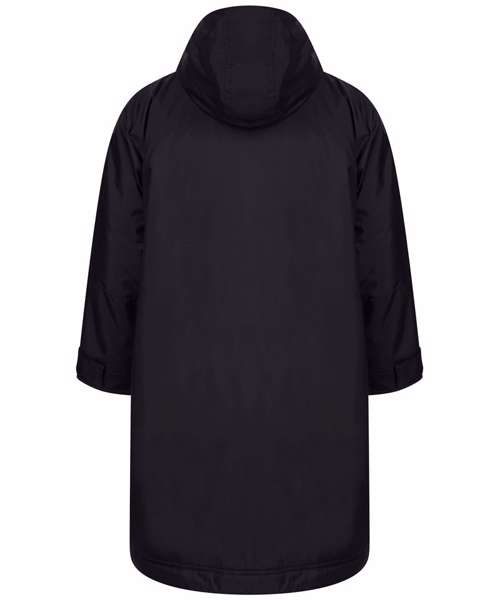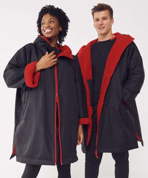 The ultimate team robe is made in a water-resistant fabric with a cosy sherpa fleece lining and three-piece hood. One size fits all, the roomy fit with double-ended full front zip allows wearers to keep warm and get changed underneath the robe. Perfect for wild swimming or wearing on team sidelines. Zipped pockets with fleece lining keep hands warm with multiple inner pockets for keeping belongings safe. Topped off with a large embroidery zip for access to directly decorate.