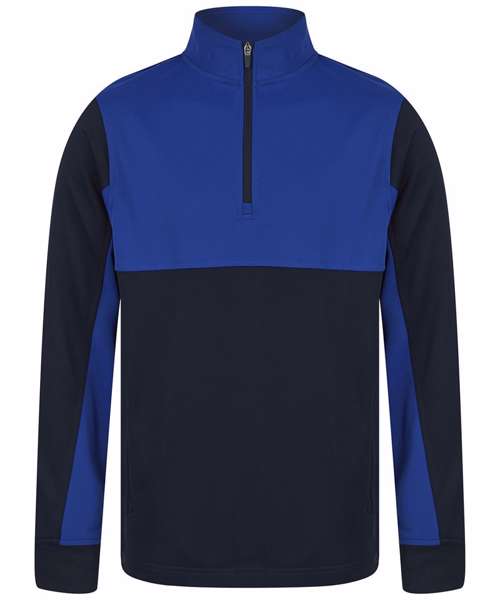 Contrast upper chest and underarm panels. Quarter zip. Side panels. Reverse nylon zips centre front and side pockets. 1x1 ribbed cuff sleeve. Semi-automatic zip pull and slider.