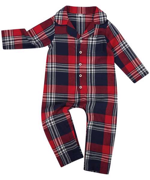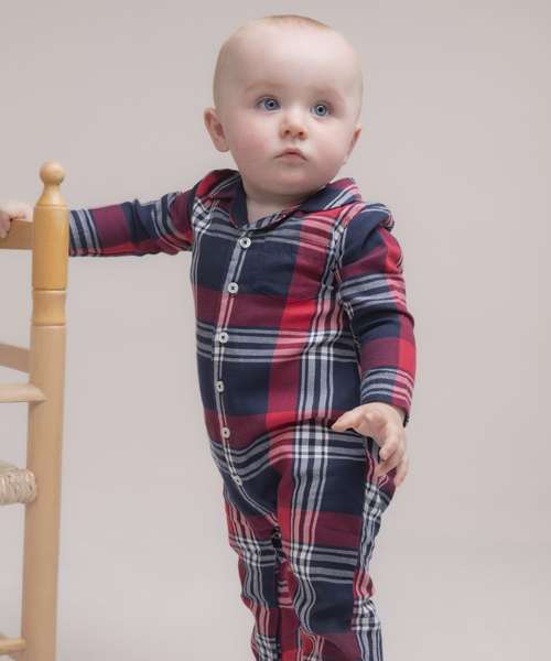Babies’ all-in-one tartan pyjamas with self-fabric chest pocket. Button-down centre front and internal YKK poppers around the inseam and self-fabric gusset. Self-fabric cuffs on sleeves and legs, and self-fabric pyjama collar.