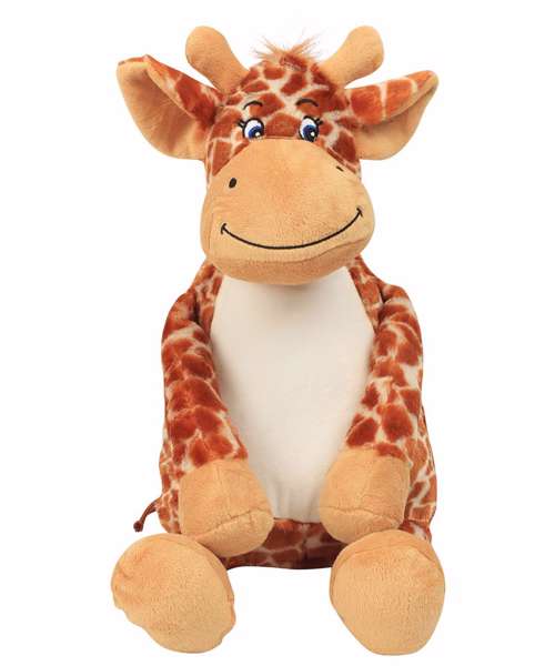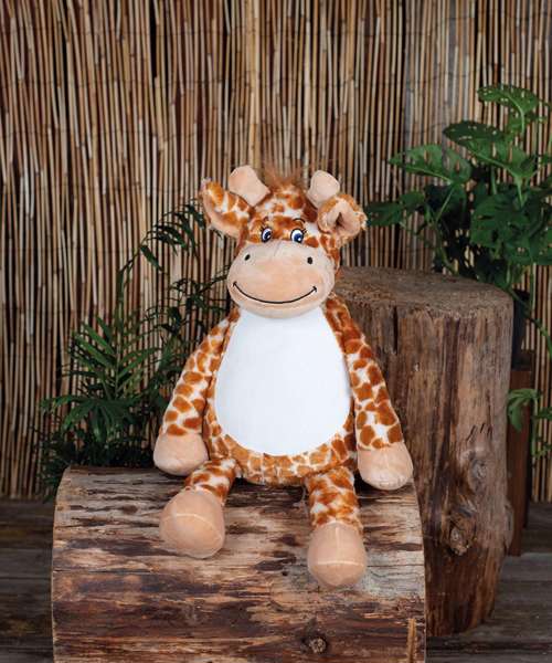 Soft plush zippie giraffe. Contrast hooves, nose, and horns. Sewn eyes and mouth. Contrast mane and the tail. White panel on tummy is perfect for decoration. Zip access on base for direct access onto the tummy for decoration. Removable inner stuffing. Can be embroidered, printed and sublimation printed. Complies with EN71 European Toy Safety regulations. Remove all hang tags and their fasteners before giving these items to a child. Suitable for all ages.