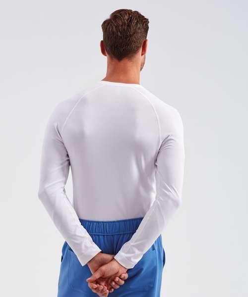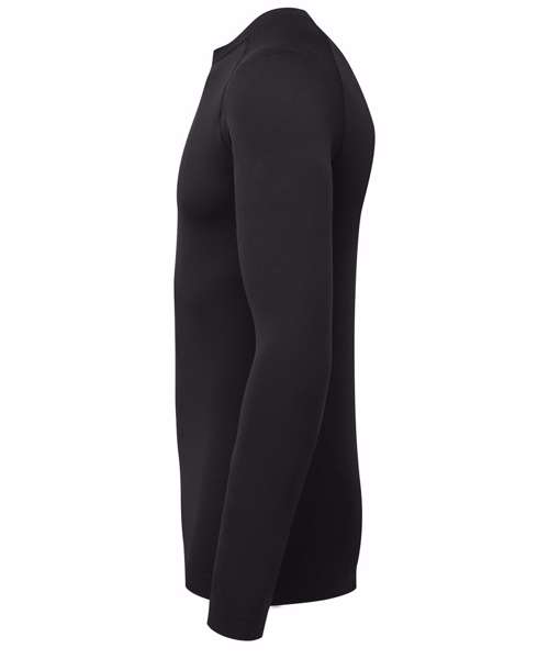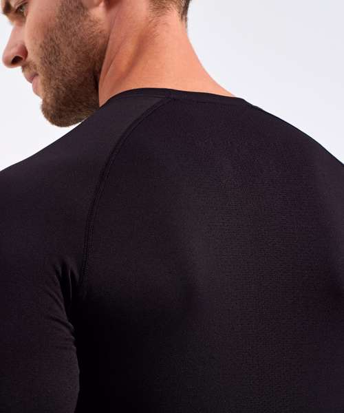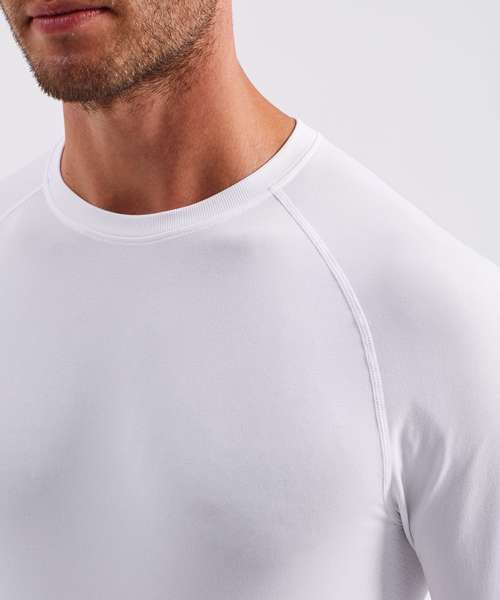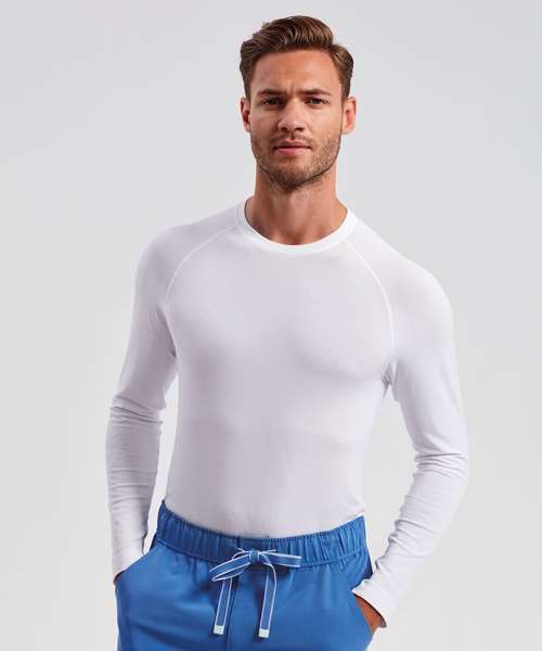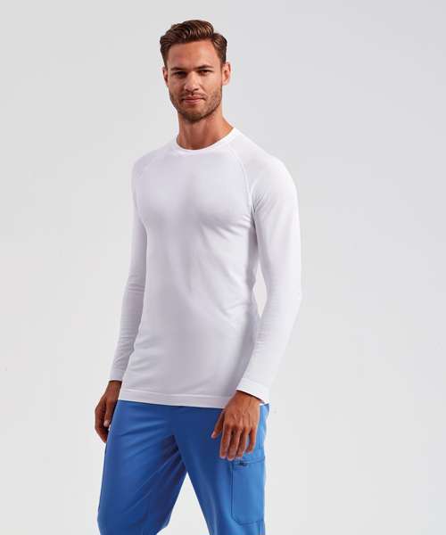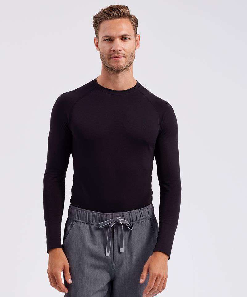 Men’s long sleeve underscrub baselayer. Comfortable four-way stretch. Breathable, easycare, crease-resistant fabric. Deodorising properties. Crew neck, raglan stitched sleeves. Seamless body with jacquard pattern. Decorate with embroidery and/or print. Contains certified recycled nylon.