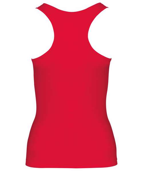 100% polyester. Quick-drying lightweight fabric. Racer back style. Bound neck and armholes. Twin needle finishing at the hem. Certified STANDARD 100 by OEKO-TEX® N° CQ 1007/7, IFTH.