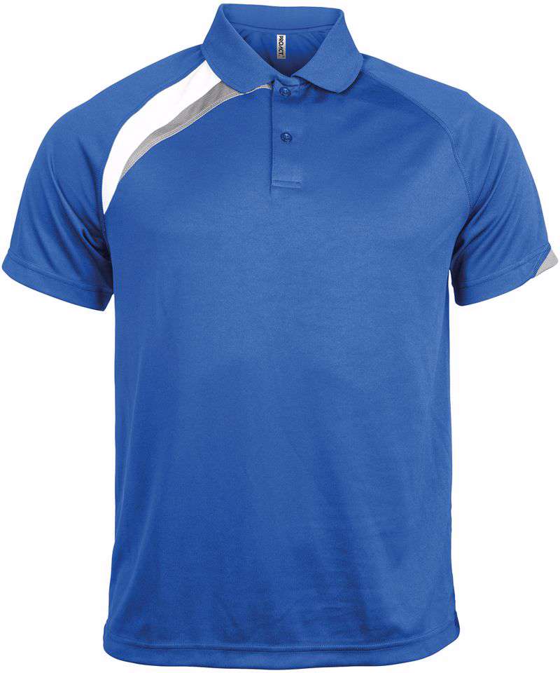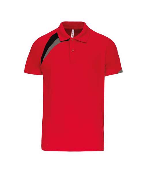 100% polyester. Quick drying fabric. Contrast panels. Flat knit collar. 2 button placket. matching cover stitch. Twin needle finishing.