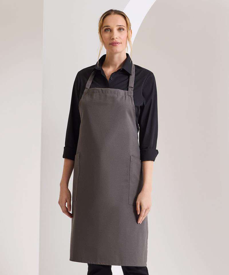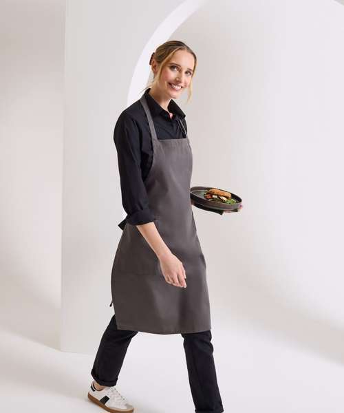 A heavyweight full length bib apron made from certified recycled polyester and certified organic cotton. Featuring two slanted side pockets and fully height adjustable with a buckle on the neckband.