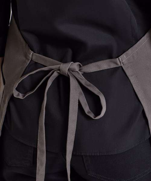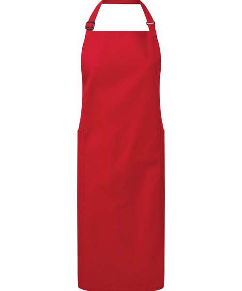 A heavyweight full length bib apron made from a combination of certified recycled polyester and certified organic Fairtrade cotton. Featuring two slanted side pockets and fully height adjustable with a buckle on the neckband. Two slanted side pockets measuring 24cm depth by 18cm wide. Adjustable buckle with gun metal finish. 86cm long x 72cm wide with 90cm long ties.