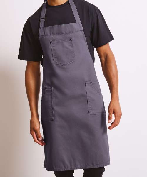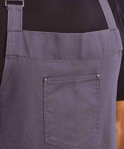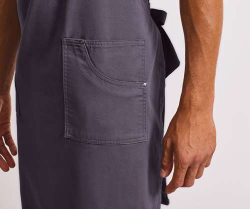 This full bib apron is designed with classic 'chino' style accents for a cool and edgy uniform solution for bars and restaurants. There are three functional pockets for design and practicality, together with a simply pop-snap button fastener to secure the neckband in place.