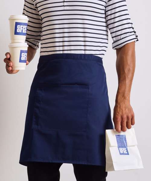 Mid-length waist apron. Tablet-friendly centre pocket with combined pen pocket. Self-fabric ties. Contains certified recycled polyester.