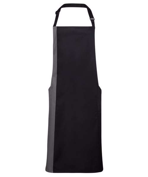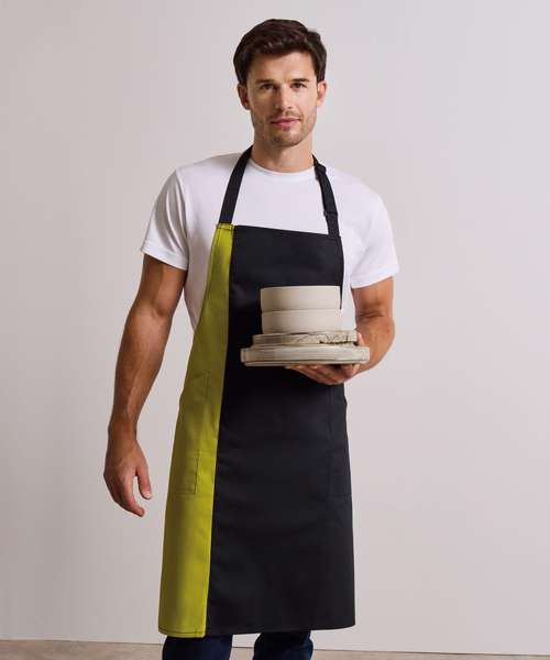 A classic full bib apron with a contrast coloured panel appearing along the length of the right hand side which can be an excellent branding solution. The colours used on this apron are part of the 'Colours Collection' from Premier. Featuring two slanted side pockets and useful adjustable buckle on the neckband.
