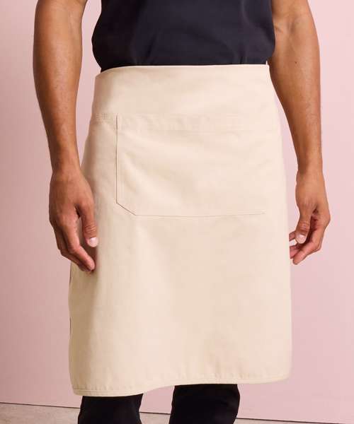 Heavyweight canvas bib apron that can also be folded down to form a half-waist apron. Rounded edges. Gunmetal/antique brass eyelets. Mitred double pocket. Adjustable knotted neckband and matching waist ties that can be fastened to the front or back. Cotton-rich with certified recycled polyester.