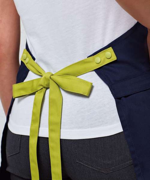 Apron body with straps sold separately for ultimate customisation (for body, see PR190). Mix and match colours, without the need for a bespoke option. Simply choose your apron body, then select contrasting neckband and waist ties available here. Straps fasten securely to this apron body using strong, self-coloured, snap-action press studs. Centre pocket with combined pen pocket. Self-fabric cloth holder. Contains certified recycled polyester.