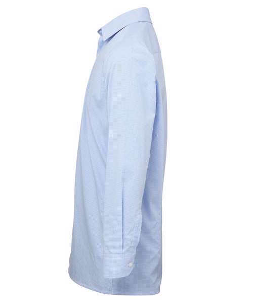 Long sleeve fitted shirt with soft collar styling. Double buttoned cuffs. Gingham pattern. Back yoke.