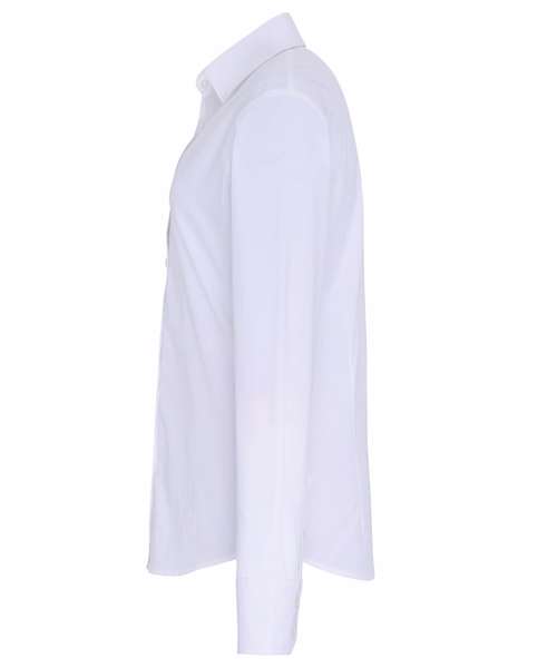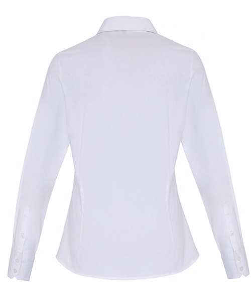 Ladies signature Oxford long sleeve blouse with wrinkle free finish for a smart and professional appearance. Soft collar styling. Rounded bottom hem. Fitted styling with bust and back darts. Pearlised buttons on light blue and white shirt, self colour buttons on remaining. Double buttons on cuff.