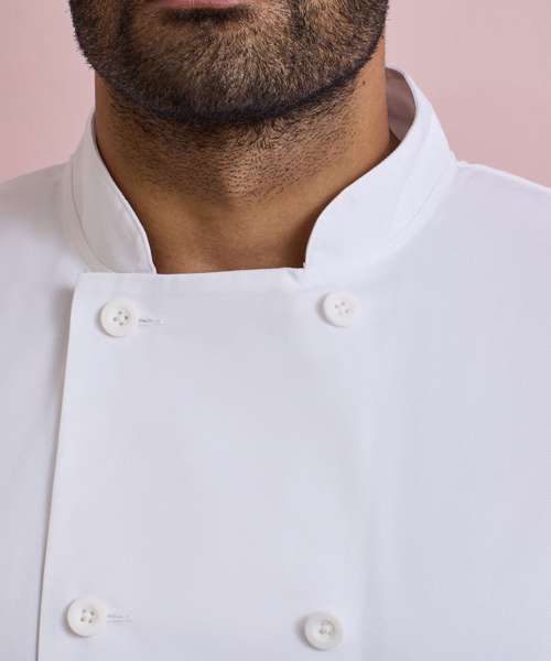 A very popular style seen in commercial kitchens, this short sleeve chef's jacket features a ten button wrap over fastening. To withstand the demands of repeated washing, the buttons are long life resin buttons. A very smart jacket for chef with a mandarin collar for a streamlined look. The left sleeve features a useful pen pocket.