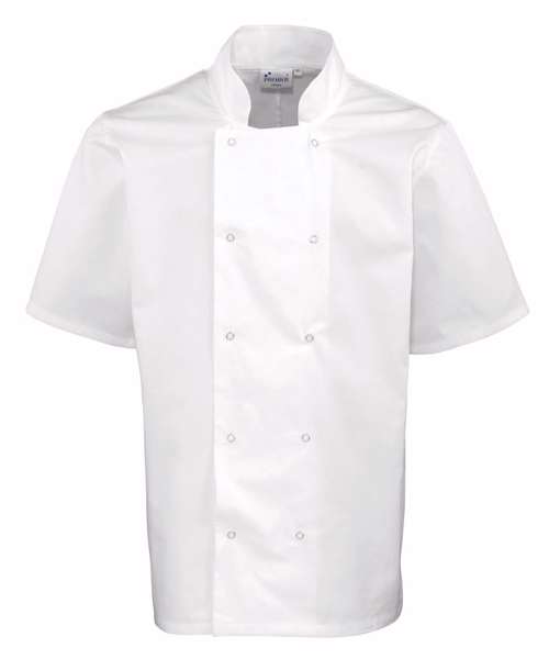 An easy-wearing short sleeve chef jacket with ten metal press studs in a popular wrap over style. Features a Mandarin Collar with topstitching and is available in Black or White.