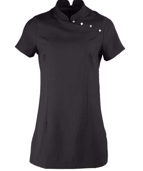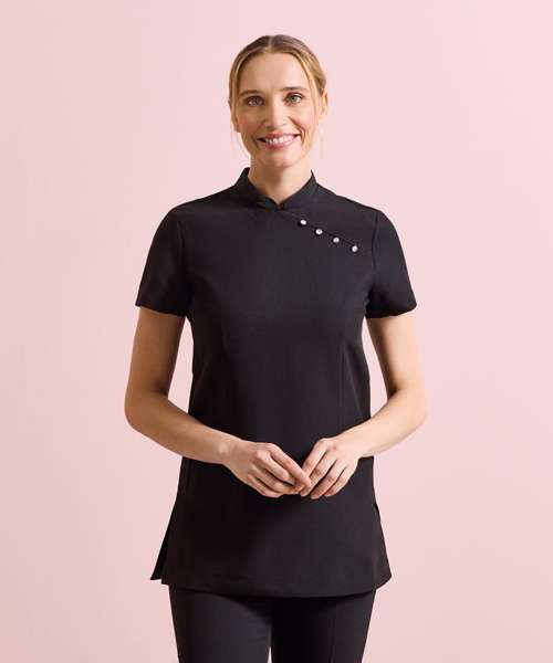 Beauty and spa tunic with mandarin collar. Side yoke detail with four feature buttons and satin trim. Princess seams and bust darts for flattering fit. Side vents. Back zip fastening. Satin piping to collar edge. Short sleeves. Easycare.