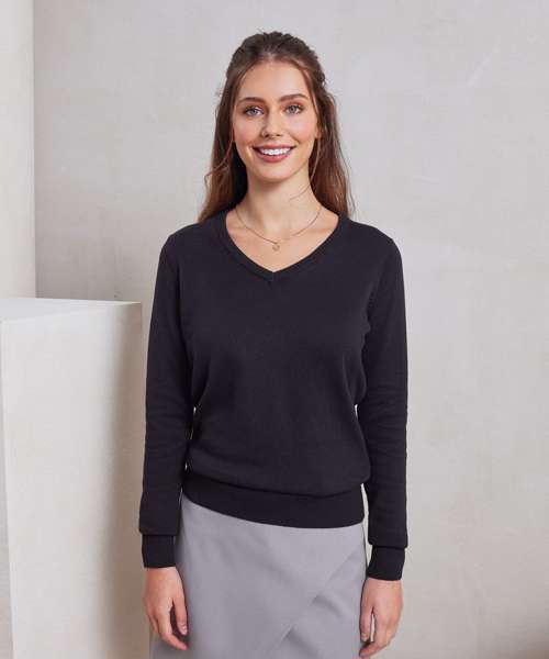 A ladies V neck jumper made from a fine gauge knitted cotton rich yarn. The V-neck styling means this ladies sweater can be worn over a blouse with a scarf on the neckline. The sleeves and hem are set in making for a really contemporary piece that is perfect for professional office environments.