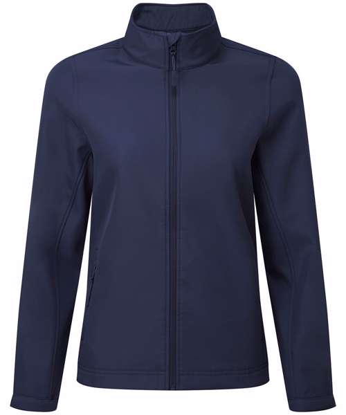 Two-layer softshell jacket with a bonded fleece inner, featuring two handy patch pockets. Full zip-through style with zip pulls. Cadet collar with chin guard. Zipped side pockets with zip pulls. Hook and loop strip on cuffs for adjustable fastening. Curved hemline with an elastic drawcord and plastic cord lock to secure in place. Stitched side panels enhance this more feminine fit. Made from 100% certified recycled polyester with Premier’s Windchecker® trademark for a wind- and water-resistant style that is suitable for screen print applications.