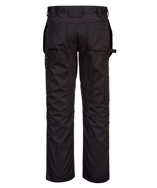 A durable polyester/cotton blend fabric allows for high-performance maximum range working, as well as comfort. Stretch panelling offers easy movement. Clever features include multifunctional holster pockets, top-loading kneepad pockets and an easy access multi-way thigh pocket for secure storage of phone, keys and tools.