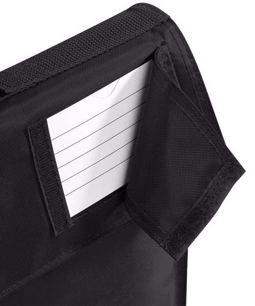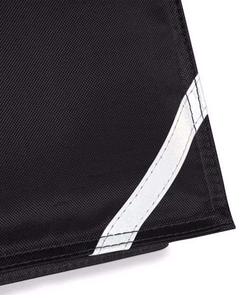 Covered name card holder. Enhanced-viz reflective stripe. Zippered internal pocket. Rip-strip™ closure. Padded handle.