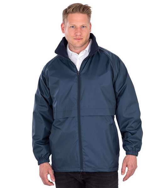 Waterproof (2000mm), lightweight, windproof. Outer: StormDri PU coated polyester. Inner: 100% Polyester, 180gsm microfleece body and sleeve lining
