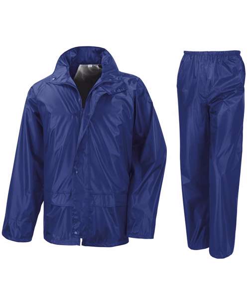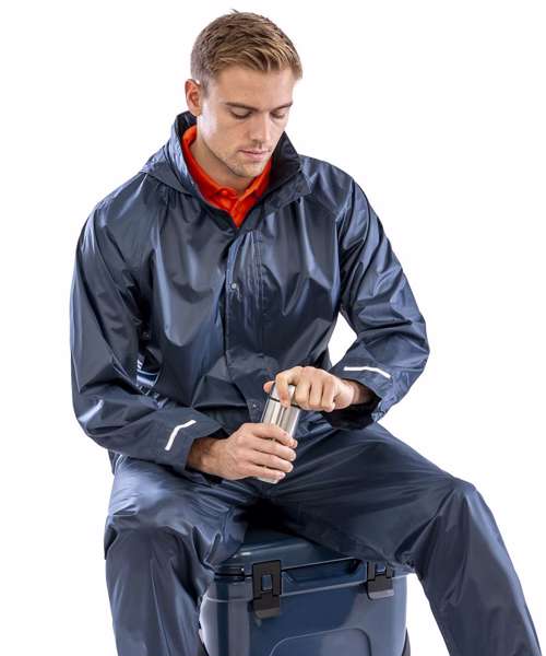 Jacket: Concealed hood in collar. Full front zip fastening. 2 spacious front pockets. Inner back mesh vent. Inner elasticated storm cuff. Stud closing front storm flap. Full-taped seams. Adjustable drawcord hem. Trousers: Fully taped seams. Elasticated waistband. 2 side pocket slits to access garment being worn underneath. Adjustable snap closing ankles. Waterproof 2000mm Windproof. Decorating methods: Digital transfer print, direct print.